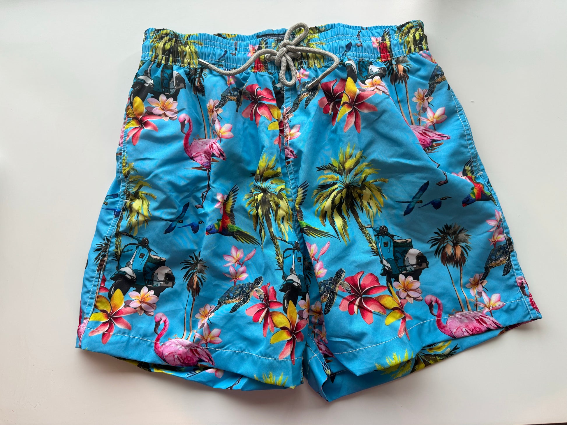 Light blue mens swimming shorts with blue vespa, lorikeet, palm tree, pink flamingo and fangipani design. Quick dry design with built in fine mesh underpants. 2 side pockets and 1 rear zip pocket to keep your valuables safe.